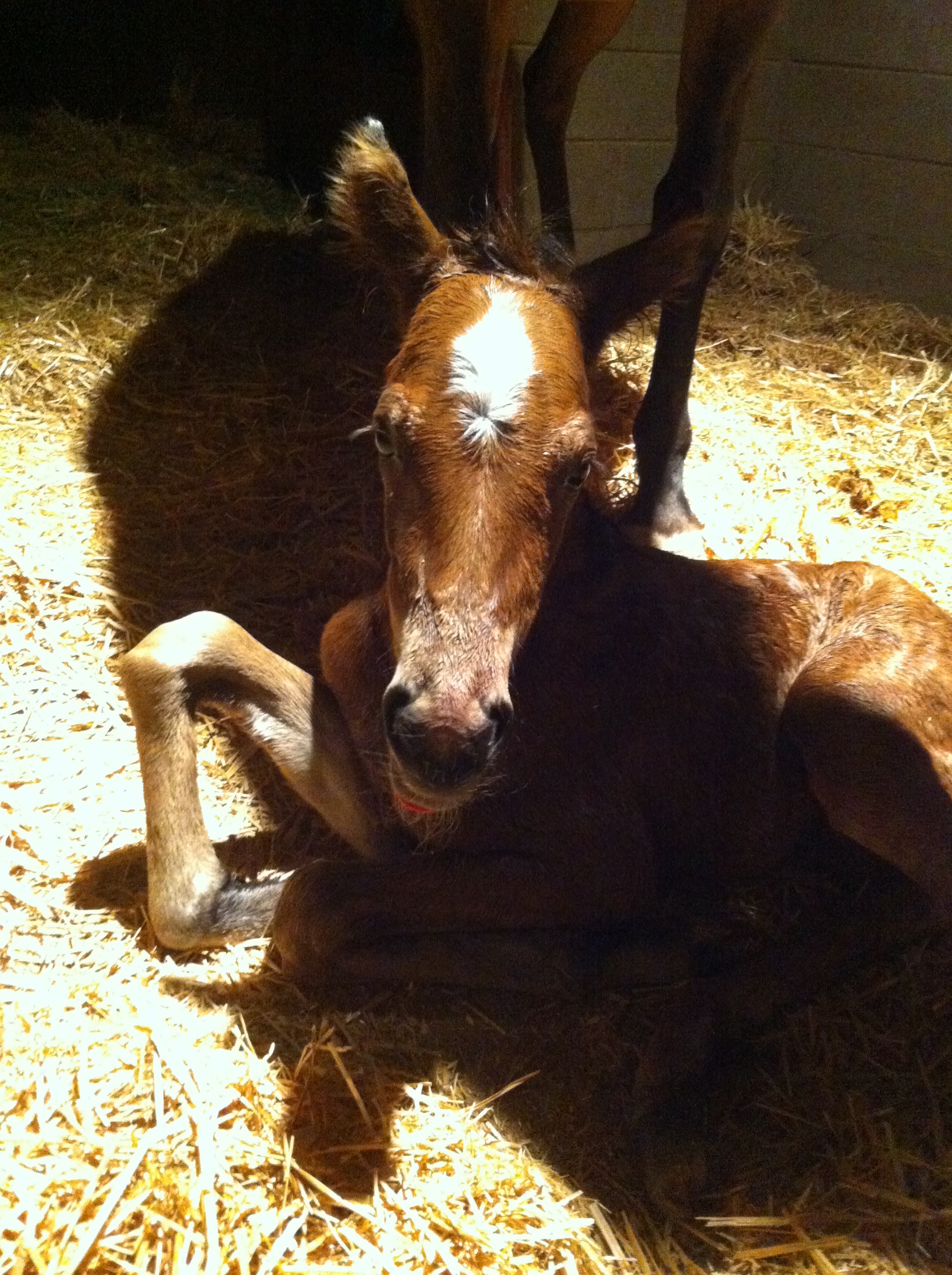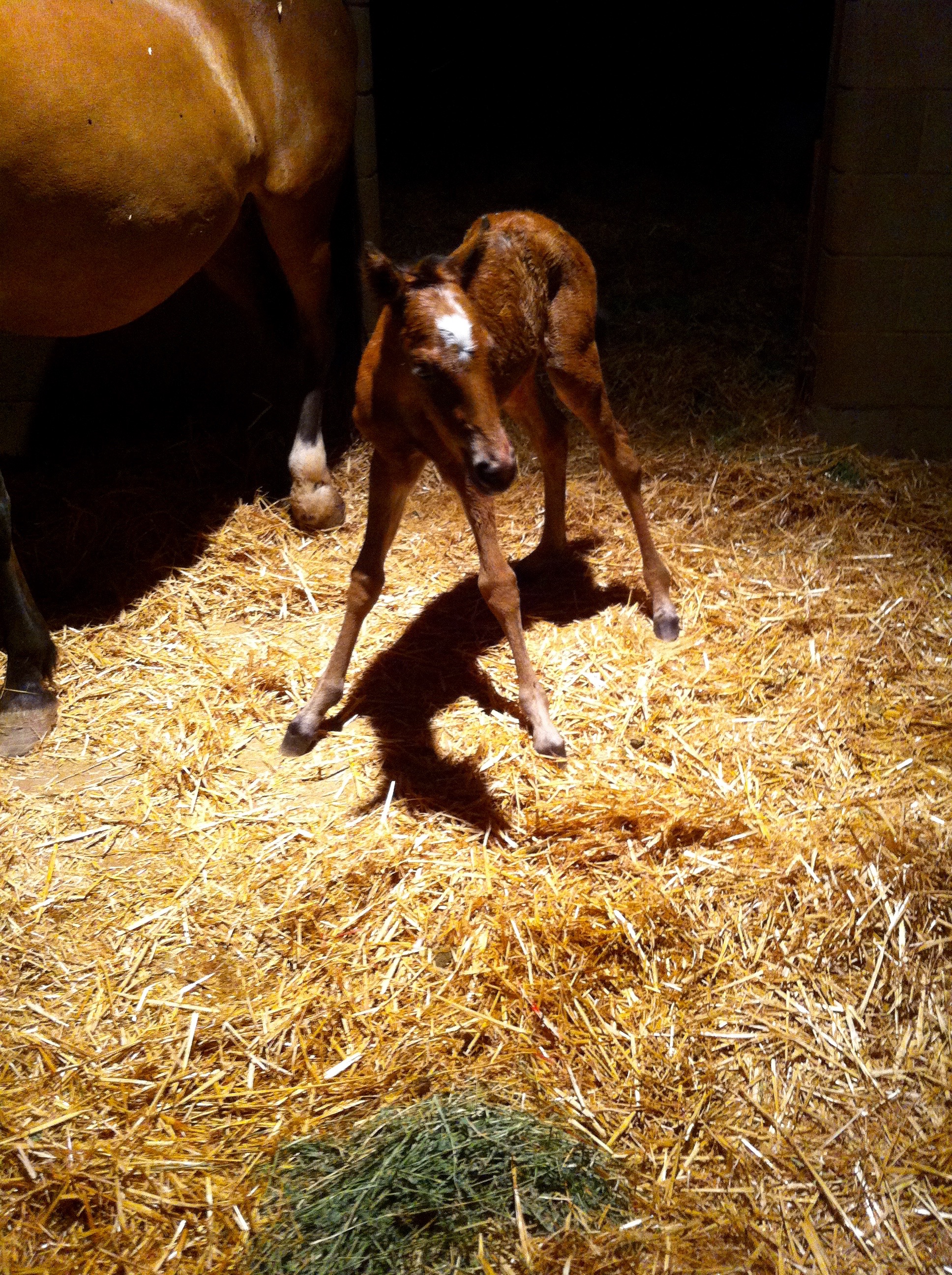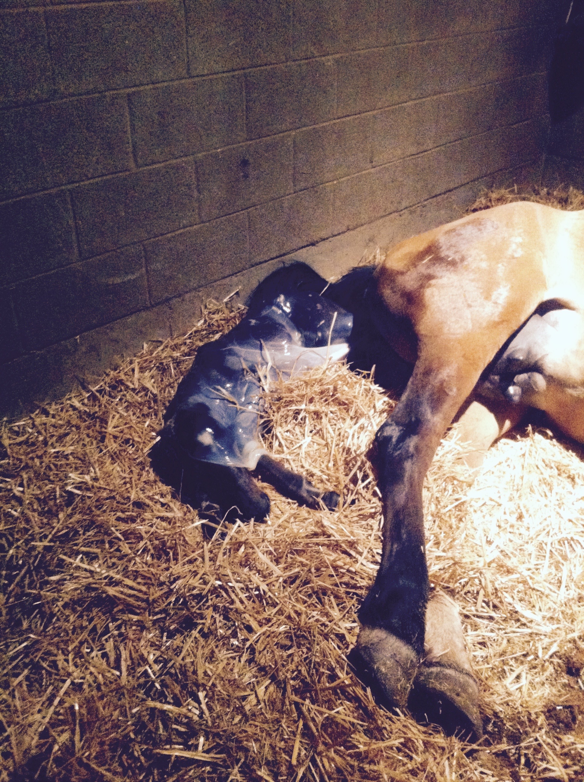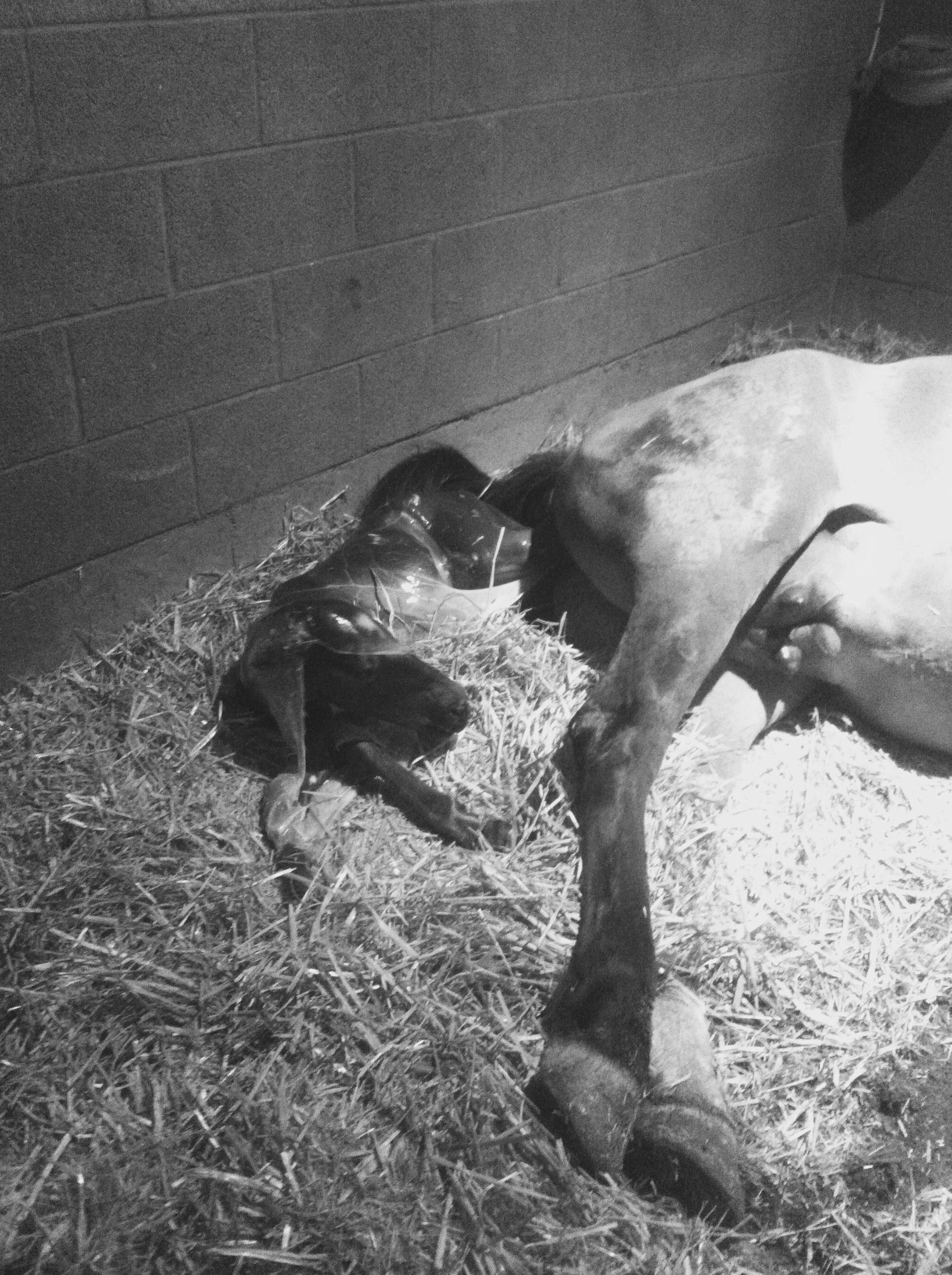 We both ran out to the stall – me abruptly hanging up on my mom (sorry, Mom!) and Jim flipping on the barn lights – and saw Rain on the ground, sides heaving. She stood up once and flopped the other way, groaning quietly. The hoof we’d seen on the monitor was still peaking out.
