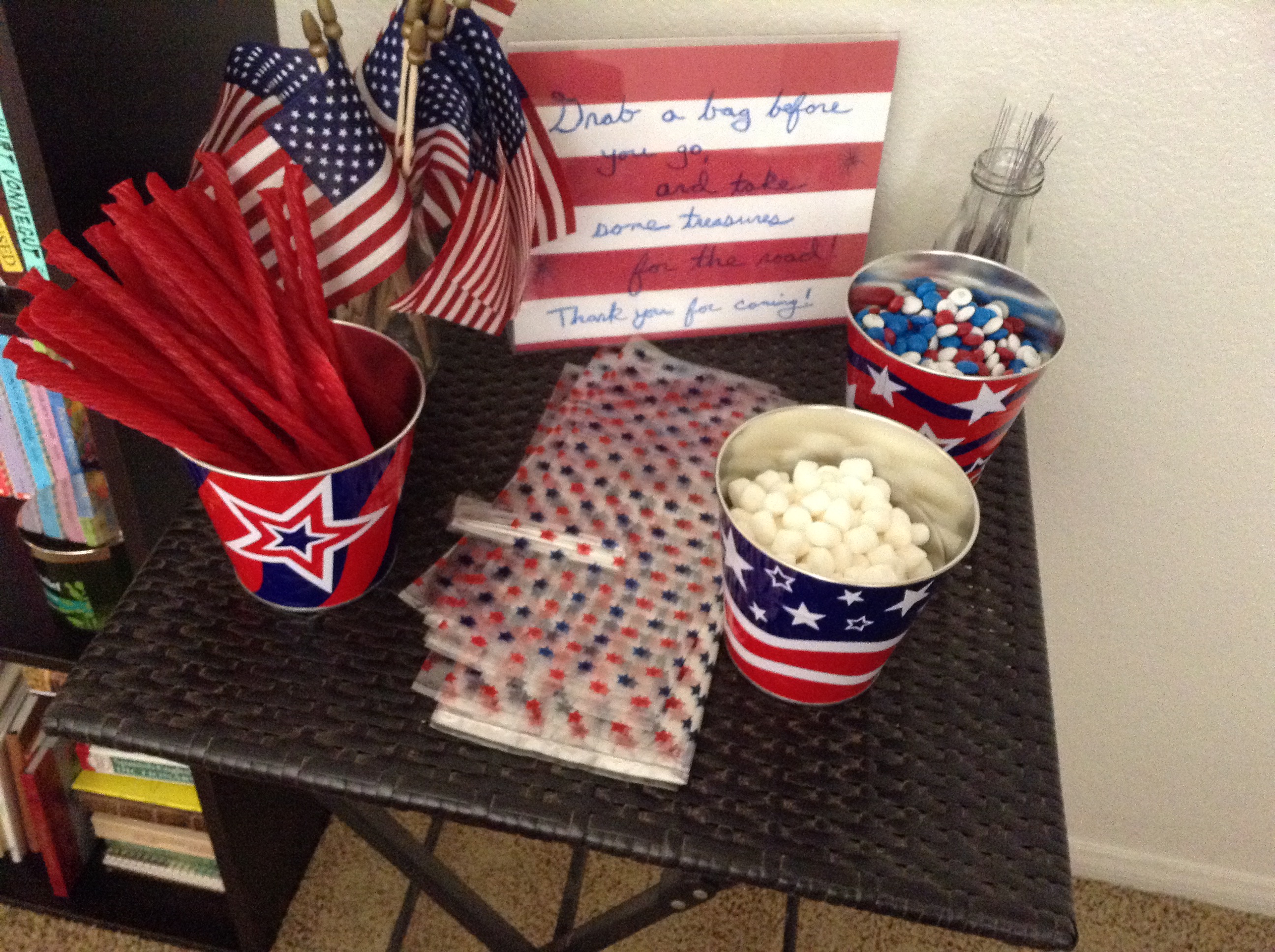 A favors table with red vines, mini marshmallows, red, white, and blue M&Ms, flags, and sparklers: