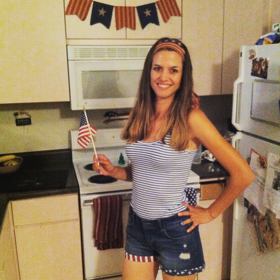 The rest of the food consisted of chips, salsa, brownies, homemade M&M cookies with red, white, and blue M&Ms, pretzel rods dipped in white chocolate and red, white, and blue sprinkles (really annoying fun to make!) and hot dogs and burgers (of course). My amazing boyfriend willingly took those down to our apartment complex’s grills and sat under the burning sun for twenty minutes while they cooked and the rest of us stood eating and chatting in the air conditioning. He also ran to get ice just before the party and was upset he’d gotten blocked ice instead of crushed because he knew how much my party meant to me and wanted it to be perfect. God, do I love him.