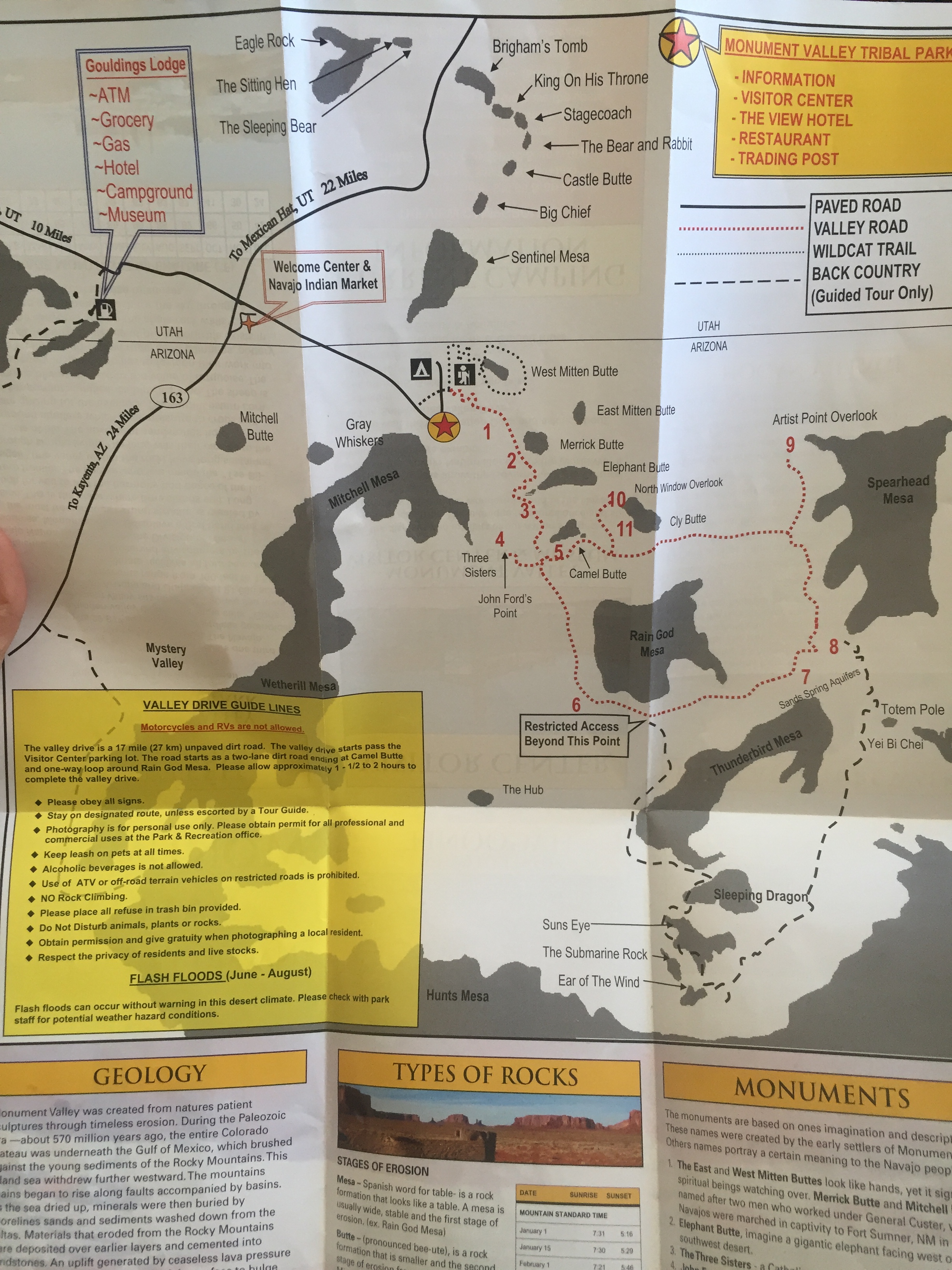 It was nearly 2pm my time, 3pm Monument Valley time, so I went inside the hotel/shop/restaurant/museum and got some food. As I ate, I looked down at the map I’d been given at the park entrance. In typical friendly but clearly tired fashion, the attendant had briskly flipped open the map, pointed to the middle, and said, “The-loop-takes-about-an-hour-and-a-half-to-two-hours-so-please-allow-yourself-enough-time-to-make-the-scenic-drive-thank-you-for-coming-and-please-enjoy-your-stay.” I’d barely grasped the concept of the existence of some kind of loop, so when I flipped open the map again I was blissfully excited to see that I could actually take my car down into the wilderness. I happily drove five hours just to look at Monument Valley. I honestly hadn’t given any consideration to exploring it.