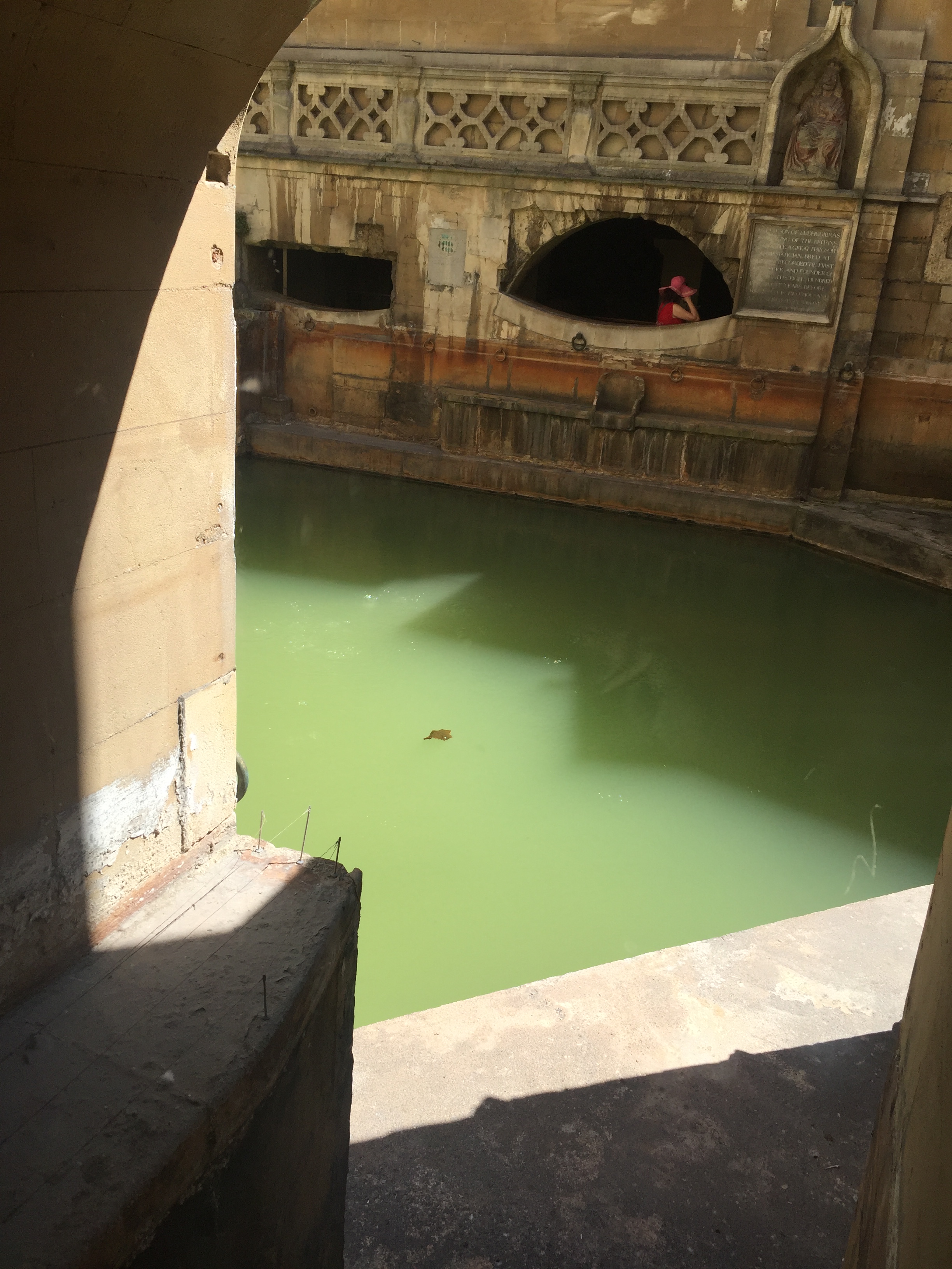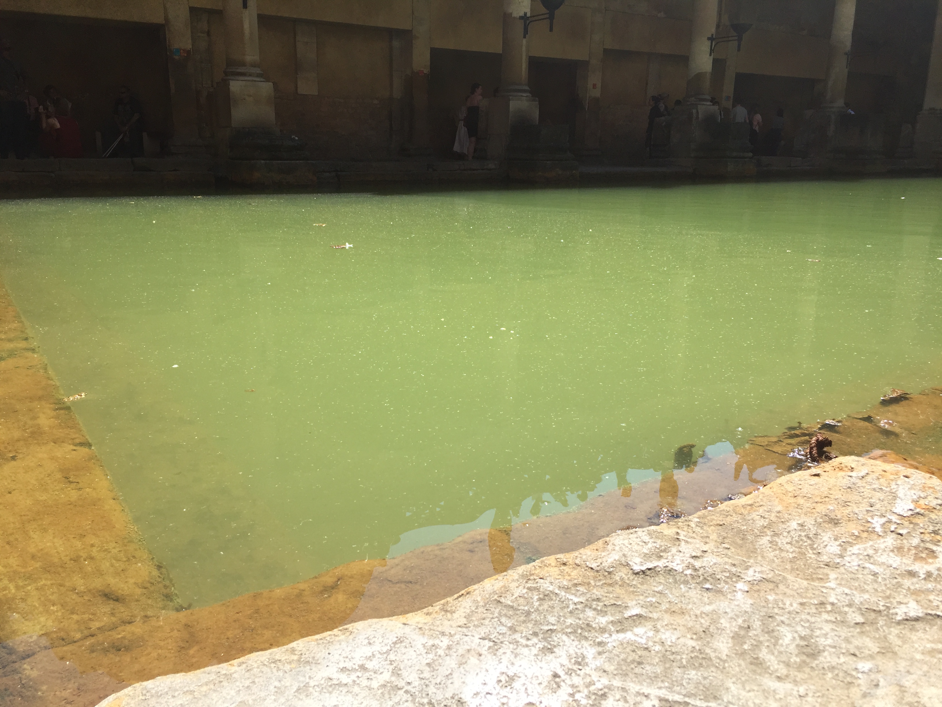Our guide made it a point to tell us a) to be careful on centuries-old cobblestone uneven surfaces near the baths, and b) not to touch the water! I found it amusing that he immediately followed with, “But if you care to drink it, they sell small cups for 50 pence at the back of the restaurant.” (I didn’t spend 50 pence on a cup of gross, murky, god-knows-what’s-in-it water but I did make a wish on 50 pence and offer it to one of the fountains.)