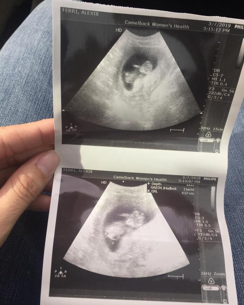 Today we had another check up with my doctor. Whereas the first ultrasound we saw a tiny little speck on the screen, this one revealed a wiggling little somebody, who squirmed when he/she was poked and moved around and even waved to us a little (his/her little hand is raised in the picture).